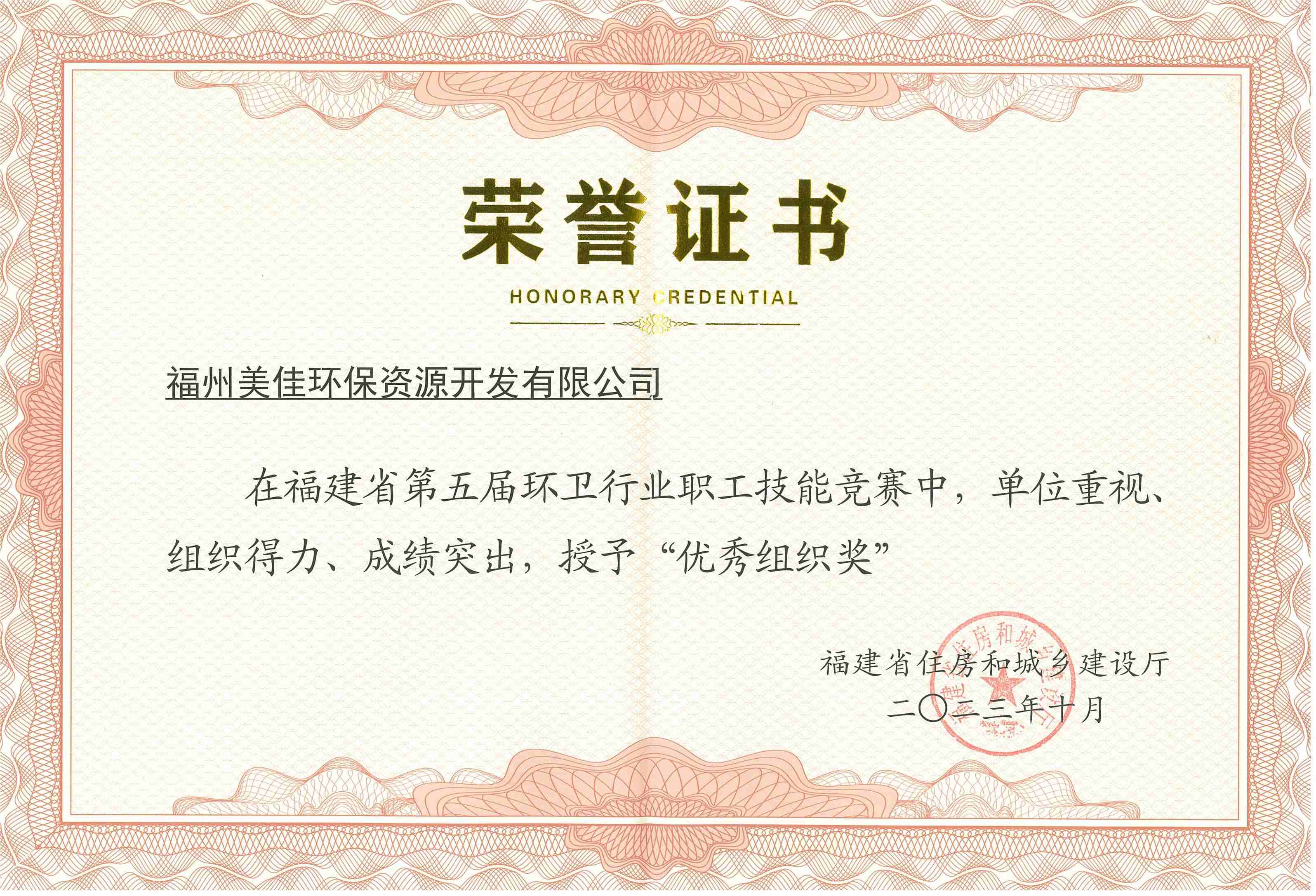 福建省第五届环卫行业职工技能竞赛被授“优秀组织奖”