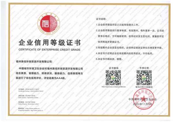 美佳环保从福州起步,经过长期以来的布局发展,现已在全国多个省市投建项目,拥有多个高素质的环保技术研发团队、环保工程建设团队,并且具有市政、环保工程专业承包、钢结构工程专业承包等多项建筑业企业施工总承包资质。其中福州市红庙岭垃圾焚烧炉渣综合利用工程多次被评为“福建省先进环保实用技术示范工程”。截至目前,公司获超100项技术专利,“国家高新技术企业”、”福建省‘专精特新’中小企业“、“全国环保优秀品牌企业”、“中国环境卫生行业企业信用评价AAA企业”、“福建省科技小巨人领军企业”、”福建省知识产权优势企业“、“福州市知识产权示范企业”等资质荣誉,并通过了ISO9001质量管理体系、ISO14001环境管理体系、ISO45001职业健康安全管理体系认证。